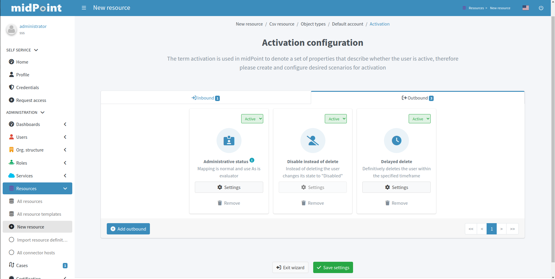 From version 4.8, midPoint contains GUI support for activation mapping. We can add predefined mappings configuration or use typically mappings. For more information see Resource Schema Handling: Activation.