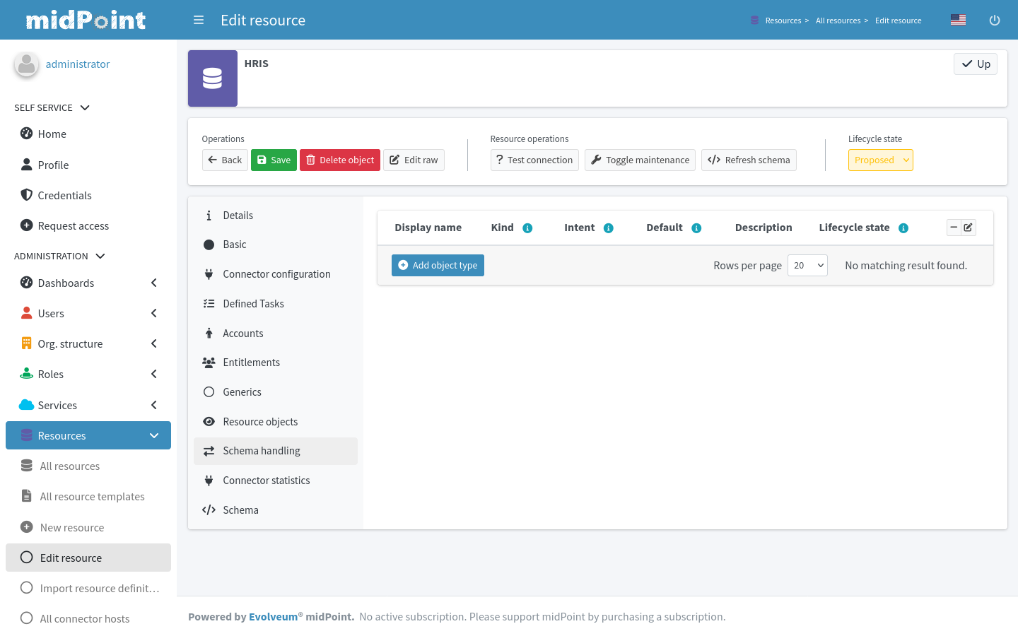 You can configure the object types for schema handling, essentially defining the behavior of midPoint with respect to the resource. You can define one or more object types based on the resource characteristics (i.e., the characteristics of the system the resource represents). For example, a CSV resource typically contains a single object type (e.g., accounts) while an LDAP resource can contain multiple object types (e.g., accounts and groups).
