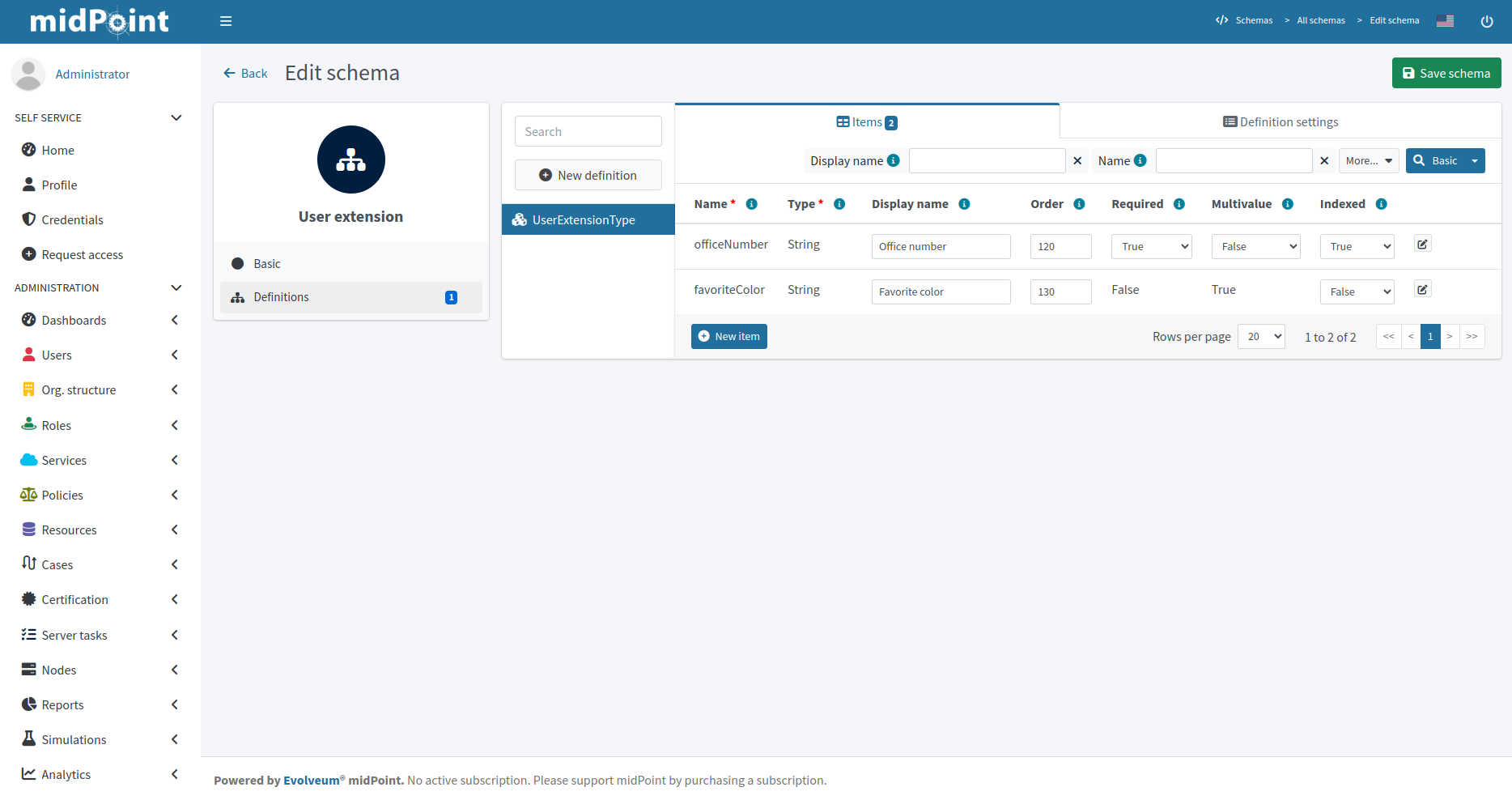 From midPoint 4.9, schemas can be configured via GUI panels. After each change, the schema is reloaded and you can immediately see the new attributes in the GUI panels of the extended object type.