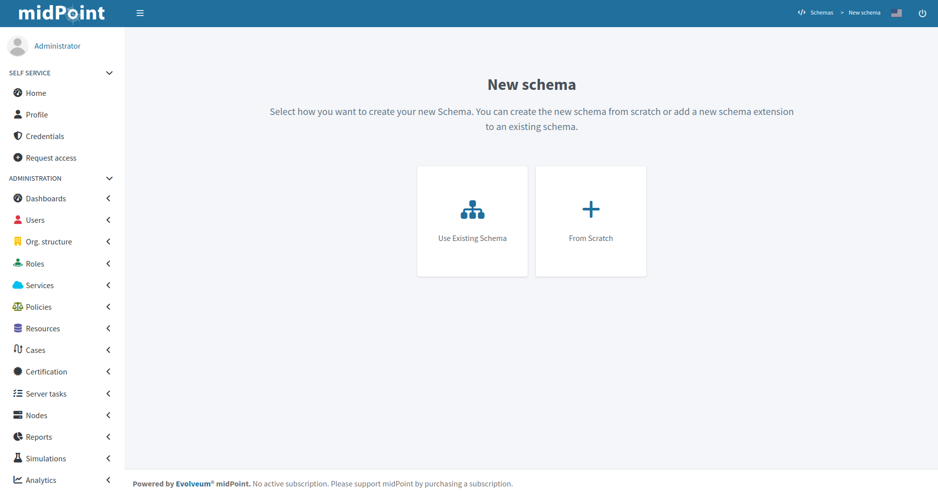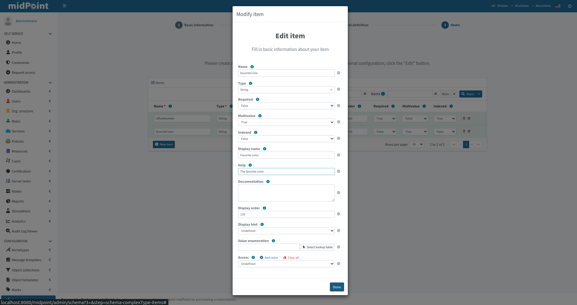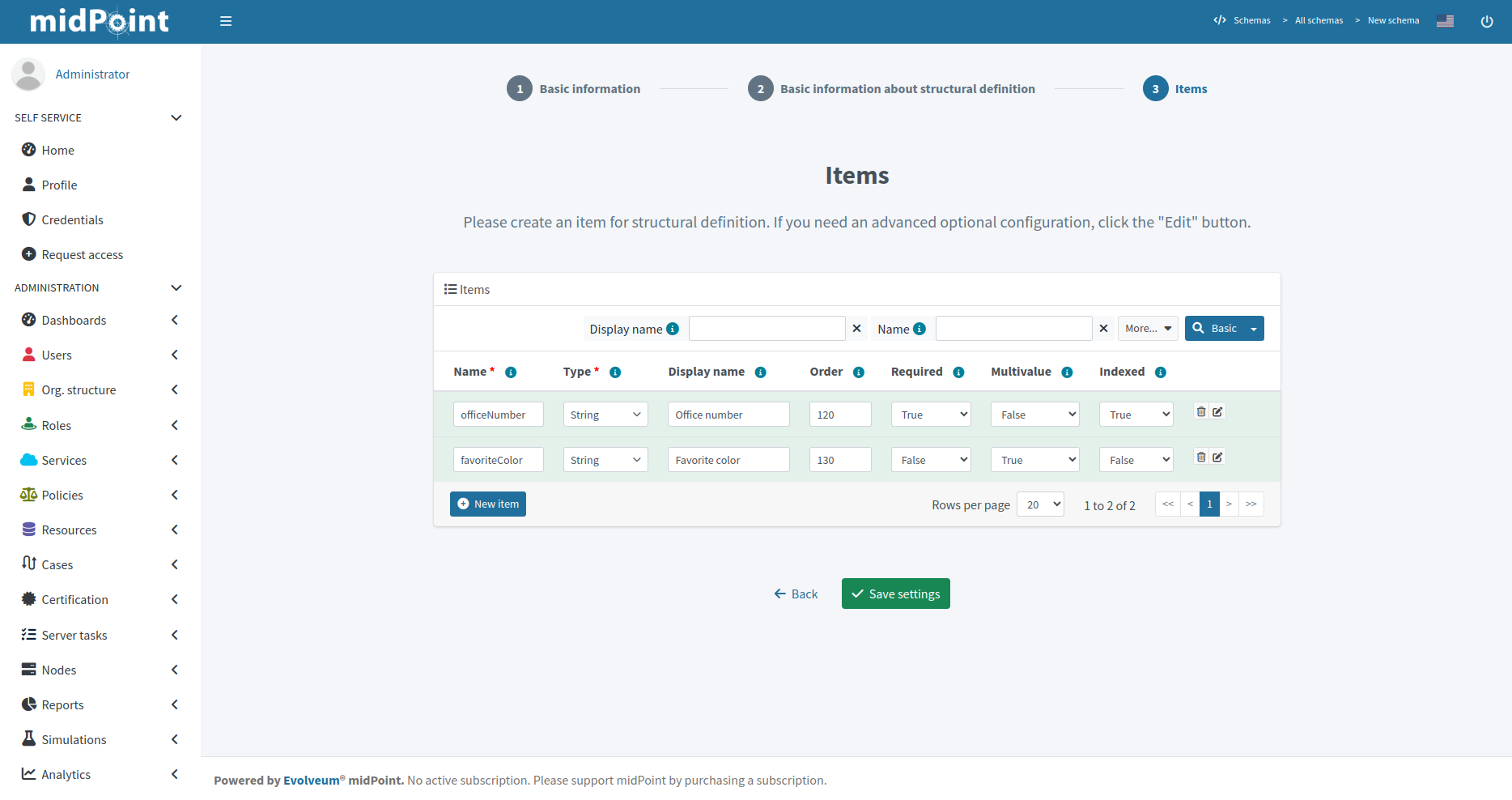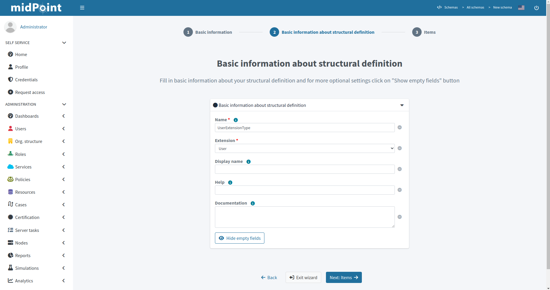 When we create a new schema, a new complex type or a new item, the GUI panel has no limitations. However, when we modify it, we run into certain limitations related to the schema lifecycle. Deleting schemas, complex types or items is forbidden because some objects may contain values for attributes created by that schema, complex type or item. Another reason is that we need old attributes in schemas for the correct display of deltas in audit records. Unnecessary attributes should be marked as removed, but should remain in the schema extension.