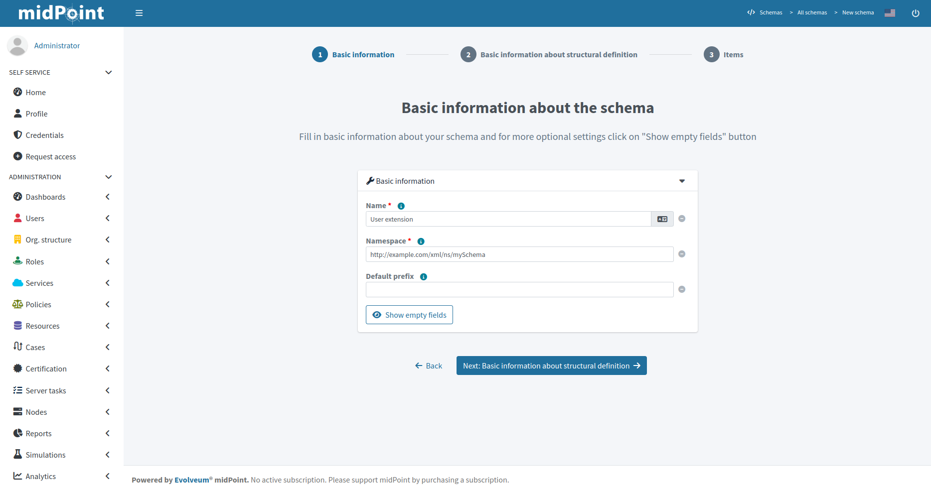 The wizard consists of 3 steps, the first of which is to fill in the data for the schema object in midPoint (Figure 2.).