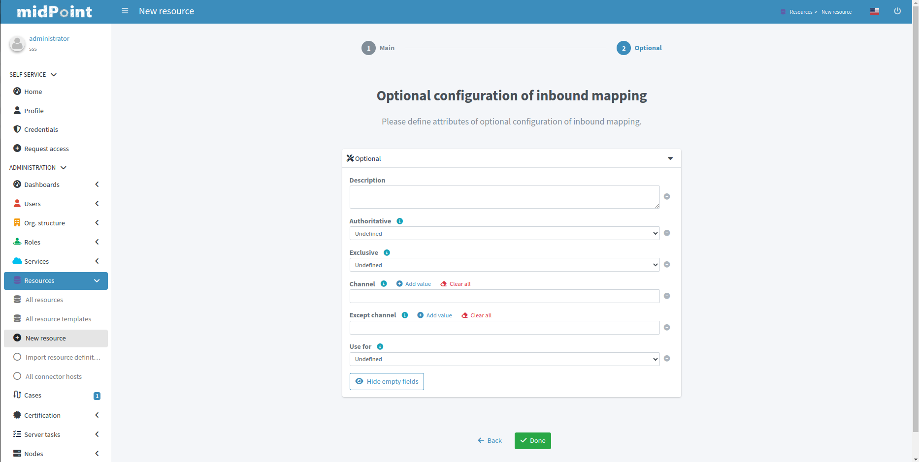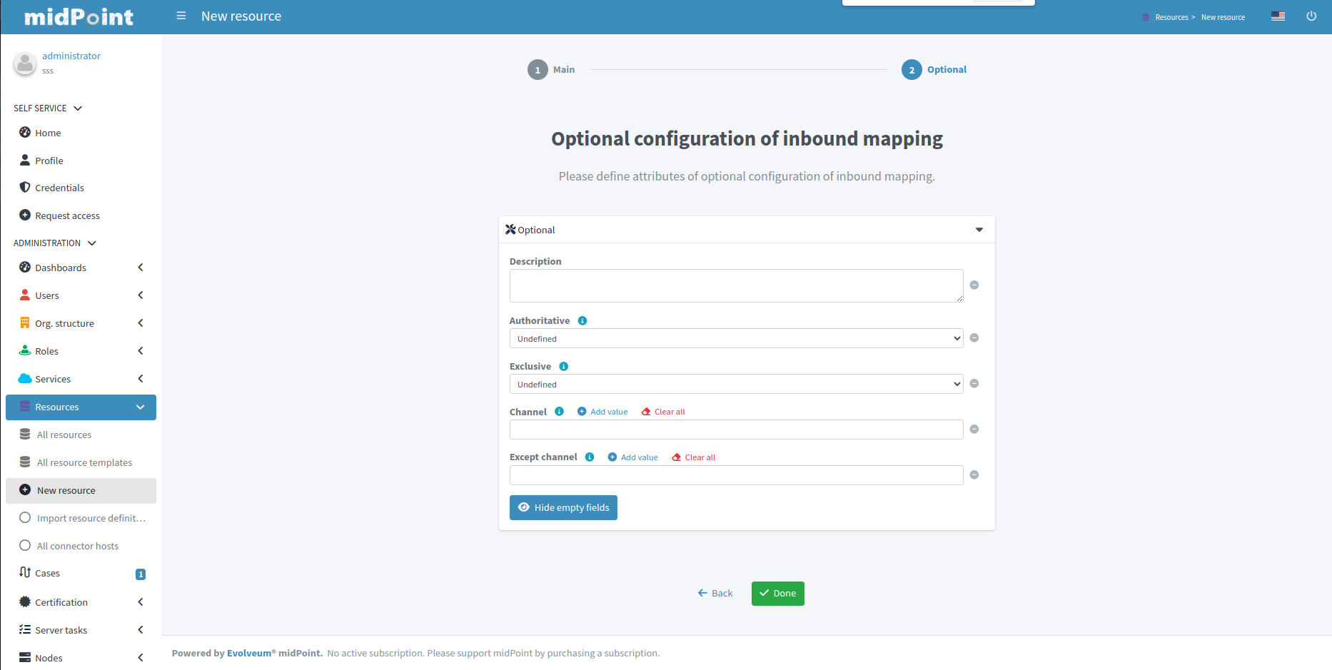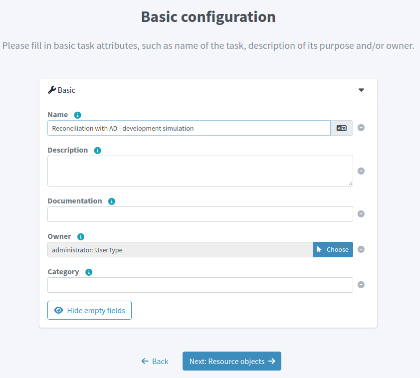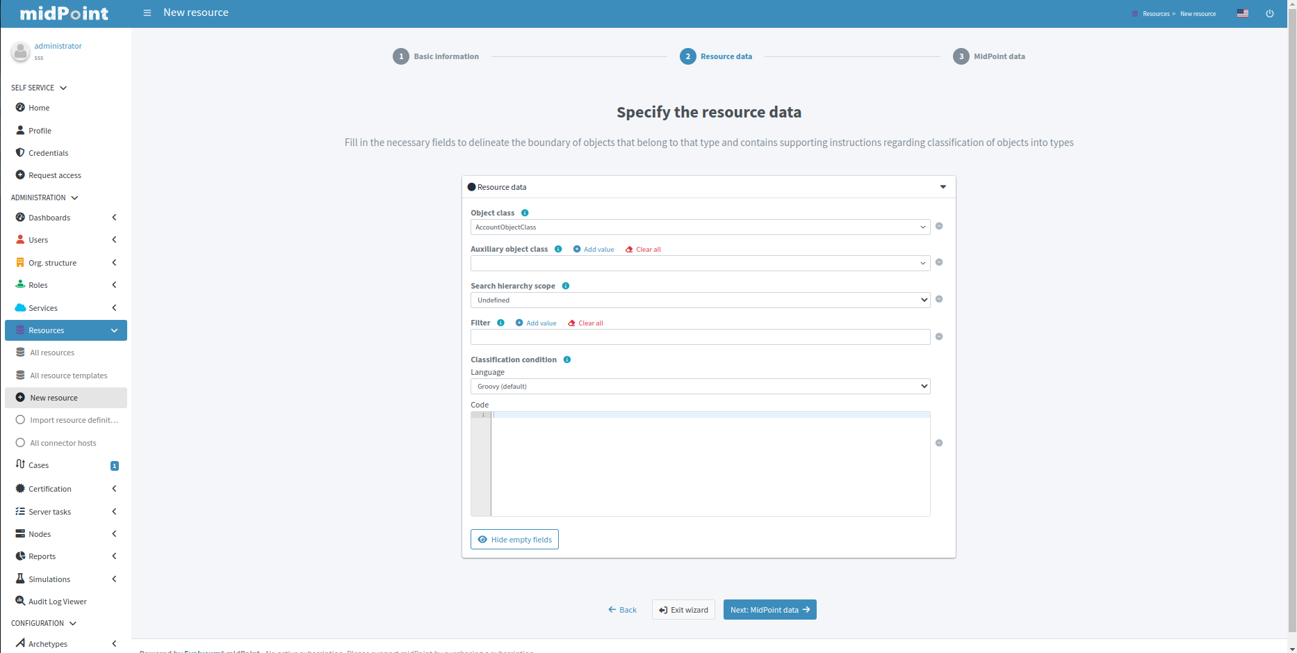 Resource wizard allows to easily create and update resource configuration. No midPoint XML language is needed, the configuration is entirely UI-based.
