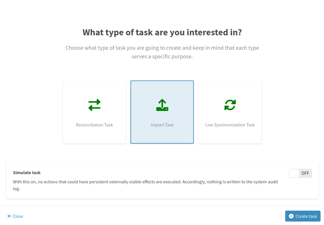Select the task to be created (Import, Reconciliation, Live synchronization) by clicking one of the tiles: