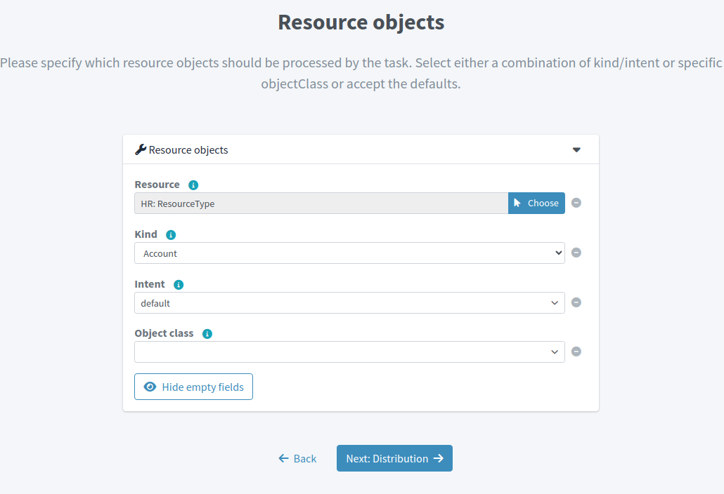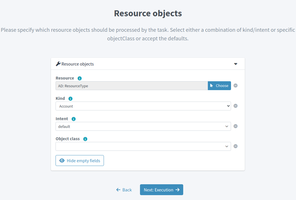 Define resource-related information for the task. Normally you don’t need to define anything as the task creation wizard will use the information from the resource and object type, where you have started it and Resource, Kind, Intent and/or Object class will be already predefined.